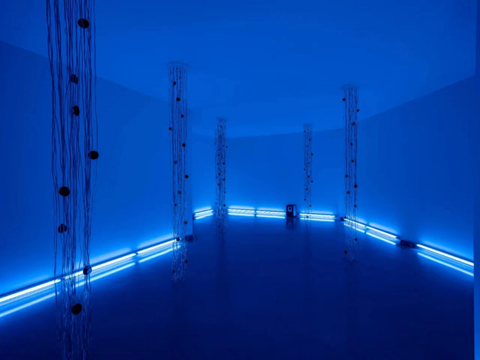 伊曼紐爾·拉加里格,《清醒夢境》,2006年,聲音裝置,21個藍色熒光燈條、8根水晶音箱線柱,110個揚聲器、12個AIFF格式音頻文件、法語版,時長:6分20秒,展覽現場,西岸美術館,攝影:Alessandro Wang