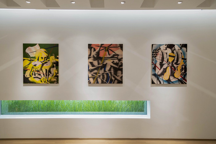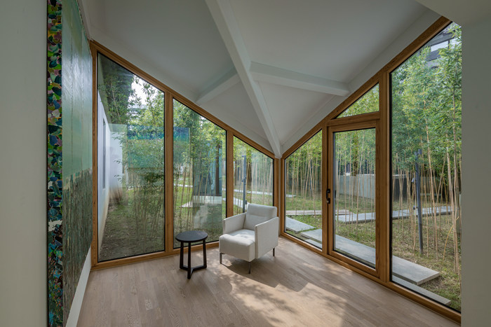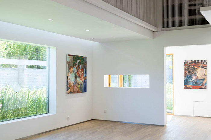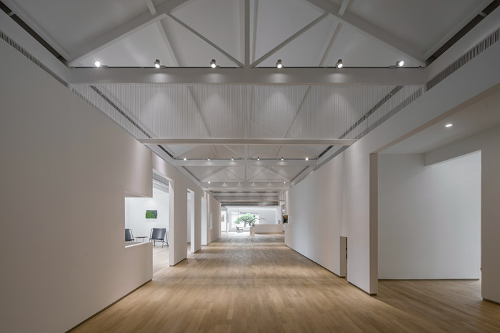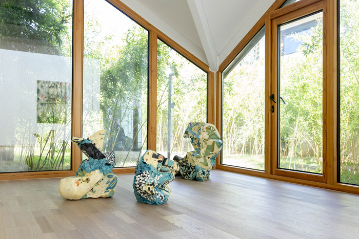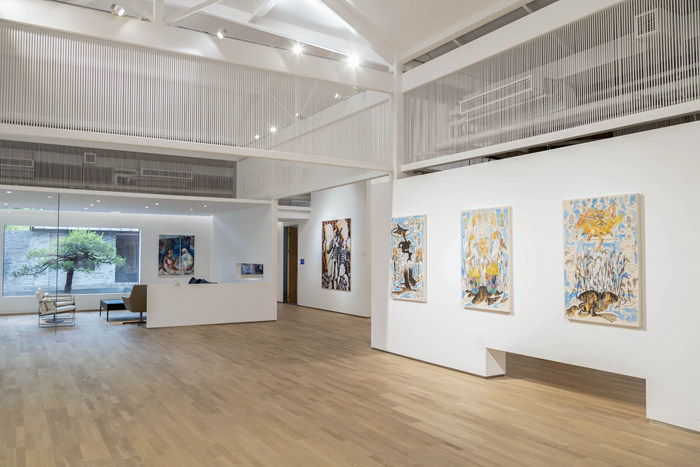 展覽空間選址在北京藝術金融國際創新園1號樓,主建筑由TEMP建筑事務所創始人、著名建筑設計師金智虎(Howard Jiho Kim)設計,力求寄情自然與返璞歸真,傳統當代藝術推崇的“白盒子”語境被打破,取而代之的藝術與自然園林景觀的相輔相成。展陳作品與建筑設計中的線條和孔洞交相呼應,在光線折轉中詮釋無限遐想。