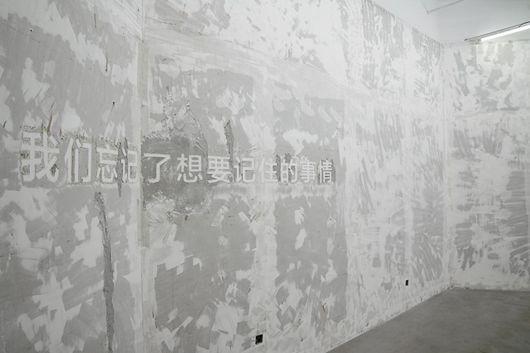 藝術家在展廳的一面墻上鑿去墻皮留出“我們忘記了想要記住的事情”,在另一面墻上鑿刻出字跡“我們記住了想要忘記的事情”兩句話。這里出現的記住和忘記變得偶然不可控,越是想要達到的卻往往事與愿違。