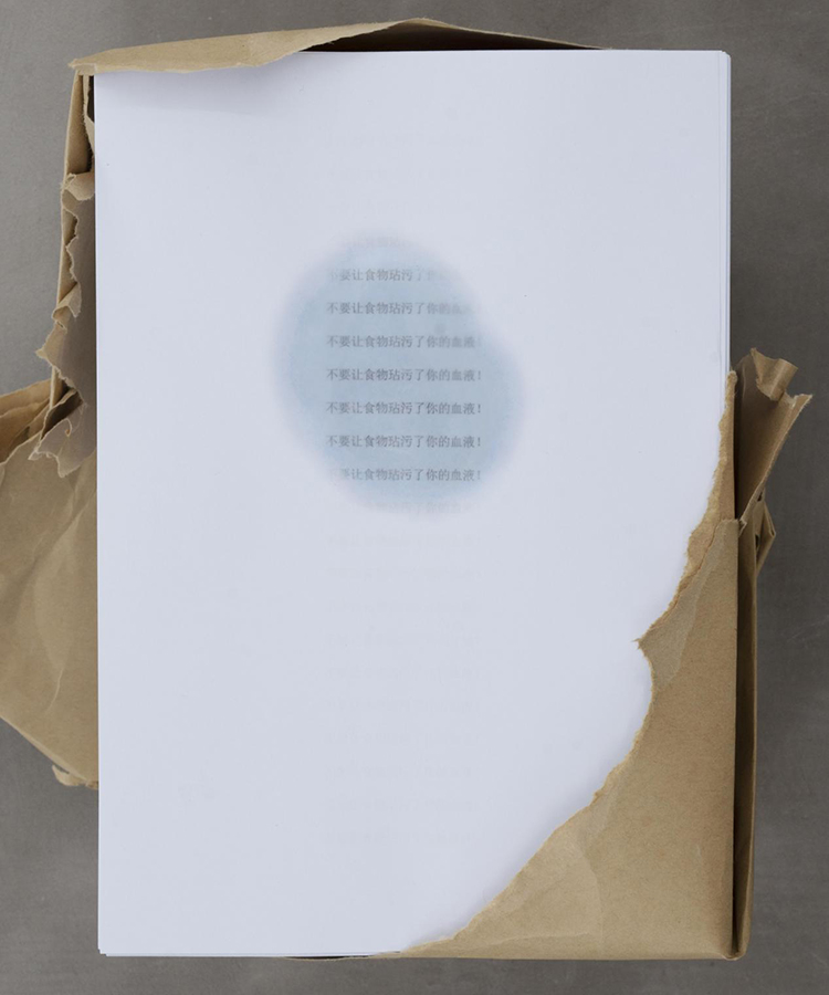 The paper, having been soaked by lard, becomes transparent to reveal the words on the next layer that were originally invisible: "Don't let food stain your blood." The sentence sounds like a belief or a warning, and the nobility of such words is defined by how a sentence is structured, such as: "Don't let money stain your eyes", "Don't let power stain your soul", "Don't let desire stain your body", etc. Such a proverb-like sentence structure usually hides a certain kind of incitement, and the widespread acceptance of the "proverb-style" language reflects that contemporary people long for some kind of discipline and guidance.