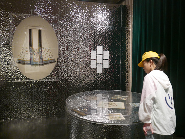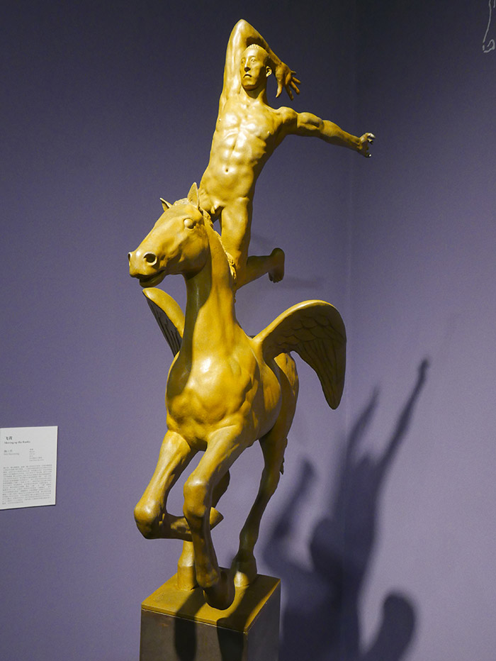 “海天麟爪”聚焦神獸,繪畫、雕塑、陶瓷、織繡等成組展品綜合呈現了龍、鳳、仙鶴的象征意味以及圖騰屬性。大尺幅的織繡展品在呈現不同的吉祥紋樣之余,同時揭示了代表性動物意象在織繡中與“色制”的密切關聯,譬如比金黃更高階、一度成為“禁色”的紫色,這也體現出相關意象的局限性與克制性?!奥沸捱h以周流”,當代藝術家以“昆侖”以及“云游”為線索的創作成為“海天麟爪”的點睛之筆:潛龍勿用,幻化成空;深藏若拙,臨機取決。
