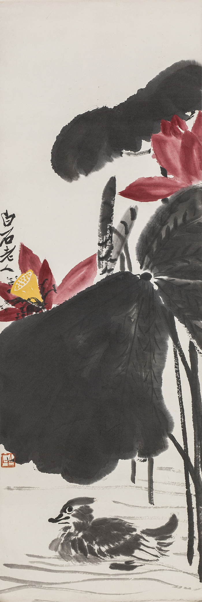 荷花鴛鴦圖 齊白石 紙本水墨設色 101cm×34cm 現代(圖片來源:清華大學藝術博物館)