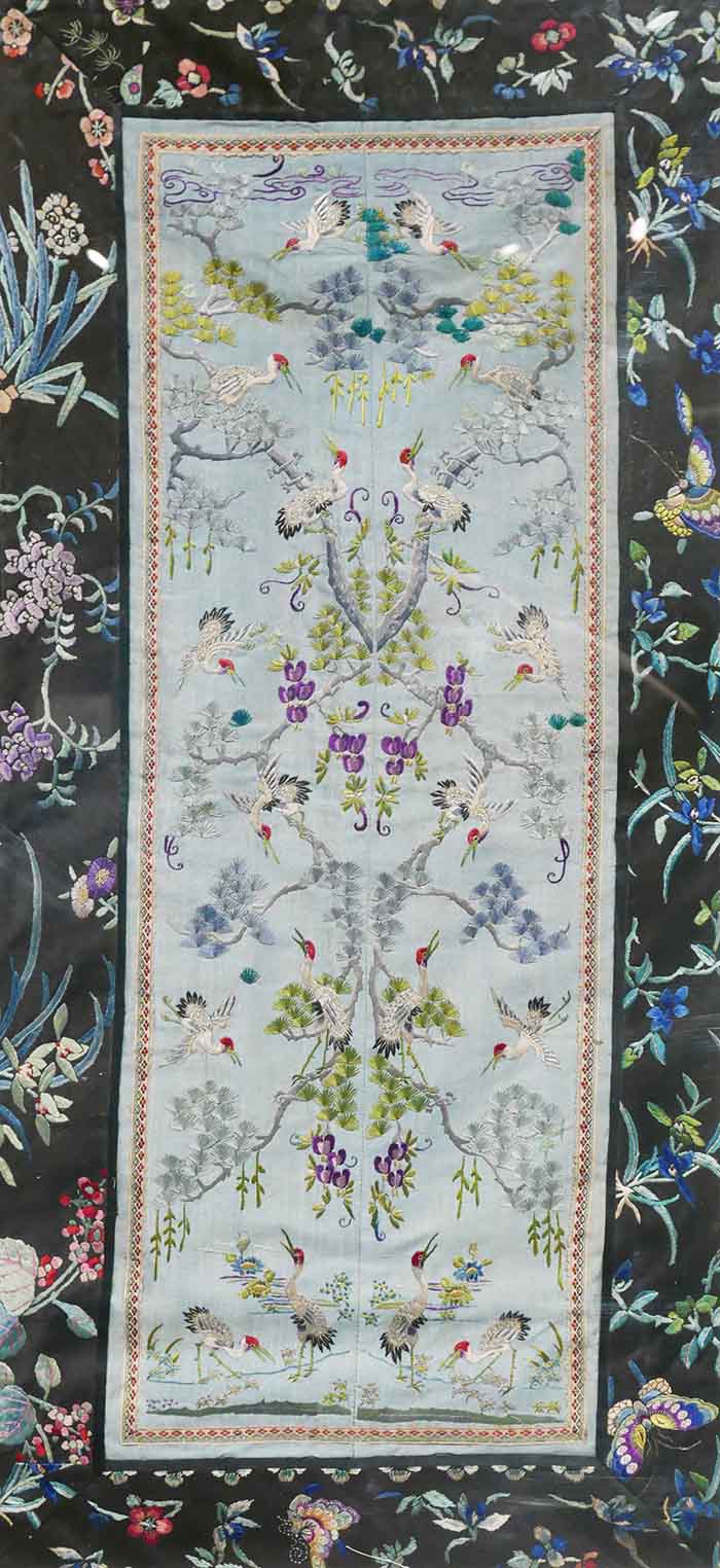 湖藍緞地平針銹鶴壽松齡紋挽袖繡片 63.5cm×30.5cm 清