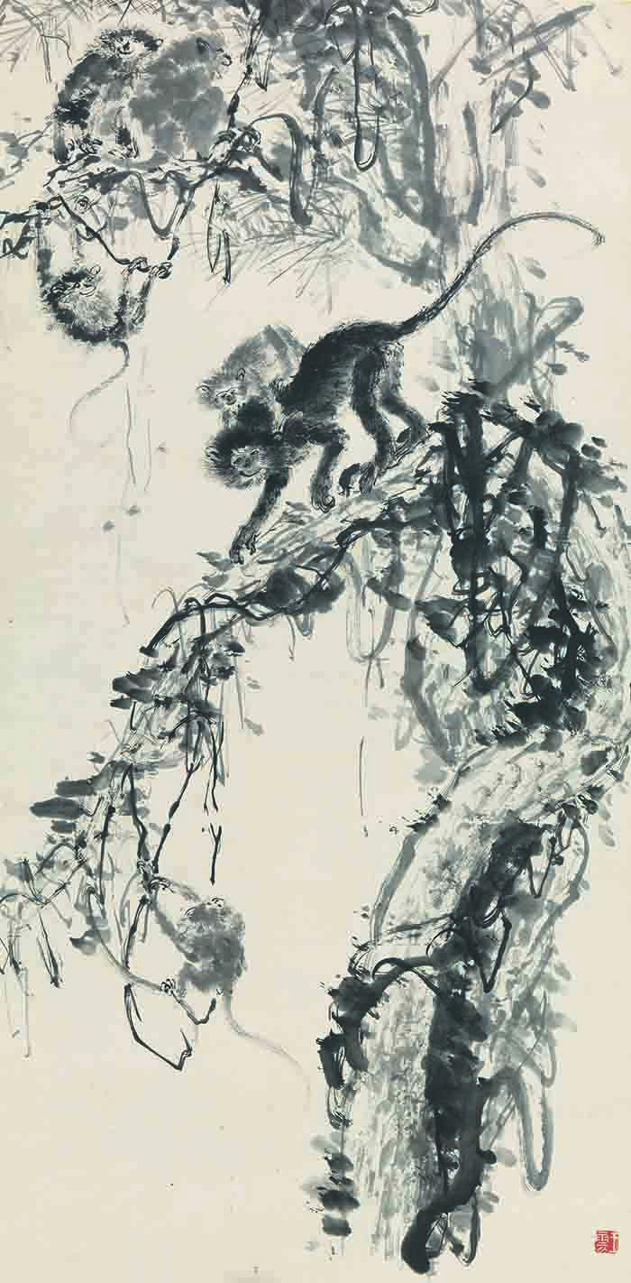 老樹頑猴 王夢白 紙本水墨 125cm×66.5cm 現代(圖片來源:清華大學藝術博物館)