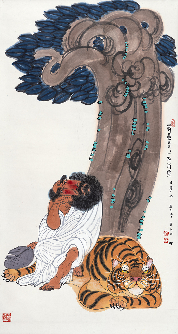 達摩伏虎圖 黃永玉 紙本水墨設色 95.5cm×179.5cm 1990年(圖片來源:清華大學藝術博物館)