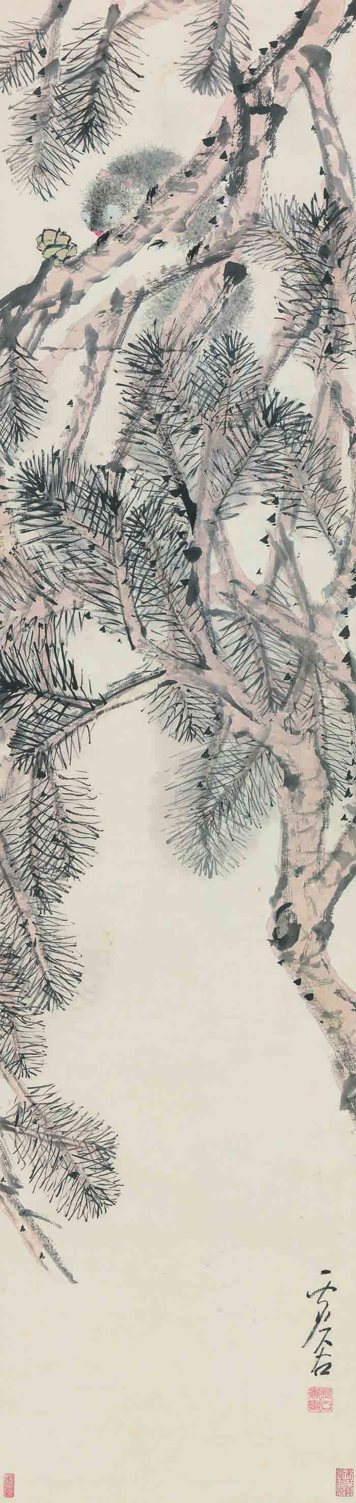 松枝松鼠圖 虛谷 紙本水墨設色 133.5cm×31.5cm 清(圖片來源:清華大學藝術博物館)
