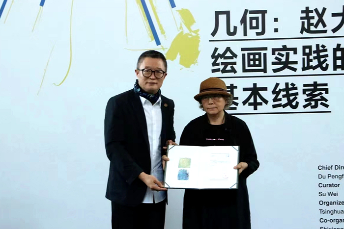 2024年7月16日,“幾何:趙大鈞繪畫實踐的基本線索”畫展在清華大學藝術博物館開幕。藝術史家、匹茲堡大學榮休教授高名潞,策展人蘇偉,清華大學藝術博物館常務副館長杜鵬飛,趙大鈞家屬趙銀鷗先后致辭。開幕式上,杜鵬飛為趙大鈞家屬于曉春女士頒發捐贈證書,感謝家屬為清華藝博捐贈趙大鈞的《作品1716》《作品3828》兩件油畫作品。
