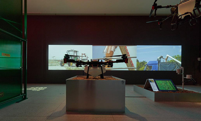 展廳入口處還未完全完成的作品—《疾飛》,講述了一種新型的“農業未來主義”,智慧農業的發展將體力勞作更替為自動化設備、無人機播種。包括《11.11》在內的三部以制造業的工廠為背景的影片,以發展進程的線性順序,呈現人在不同的發展階段、生存環境中的狀態。