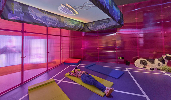 在浦東美術館的二樓,一只巨型的藍紫色充氣章魚攀附于“曹斐-潮汐宙合”的展覽海報上,膨脹的觸角黏附于展墻并蔓延到地面。隨即進入展廳入口,左右兩扇相同的仿若太空艙式的鐵門讓觀眾不知該去向何處。任意推開一道,進入一個錯置的時空,在過去、現在、未來,真實與虛擬間錯亂。