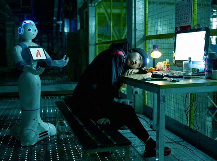 2018年,時隔12年之后,曹斐創作了《亞洲一號》,作為對《誰的烏托邦》的回應。06年是中國的制造業蓬勃發展的時代,到18年中國的社會產業結構大幅轉型,從依靠工廠車間流水線的人工勞動力轉為自動化生產,進入智能化、大數據時代。處在社會產業結構轉型之時,曹斐構建了一個滿懷狂想的工廠,場景設置在以京東為模型的大型全自動物流中心。超高效的機器運作,日復一日的重復作業麻木人心,兩個孤獨的員工產生內心的疏離,進而人與機器產生共鳴,發展成了兩個人與機器人的三角關系。