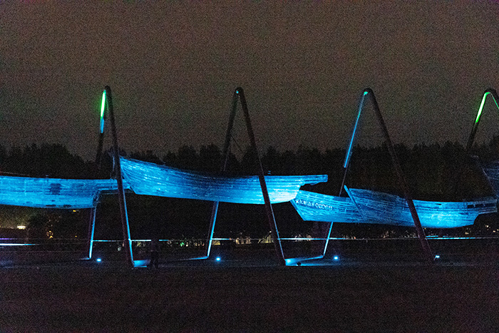 在眾多裝置藝術作品中,尤為引人注目的是矗立于中心廣場的超大型裝置藝術作品《穿越》。這件作品整體長度達126米,最高處達11.6米,由12艘秦皇島當地廢棄的木質漁船構建而成。每艘漁船長度均超過12米,依次首尾相連,懸于半空之中,似乎是在向著天際遠航,給人以強烈的視覺沖擊與心靈震撼。這件作品由藝術家尚春創作,王井作為技術支持。尚春說:“千余年來,這種木結構漁船是當地漁民重要的生產工具,承載著無數代人的繁衍生息。如今,它們進入了‘退休’期。我們運用裝置藝術的創作手法,通過滄桑而樸素的視覺語言,詮釋了一個新時代的征程,寓意向著未來更廣闊的空間遠航?!?/p>