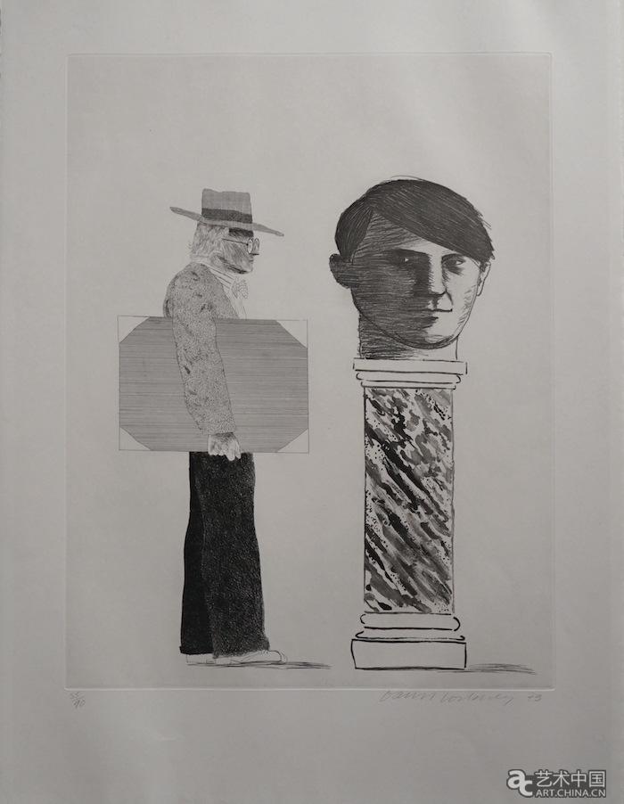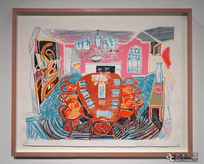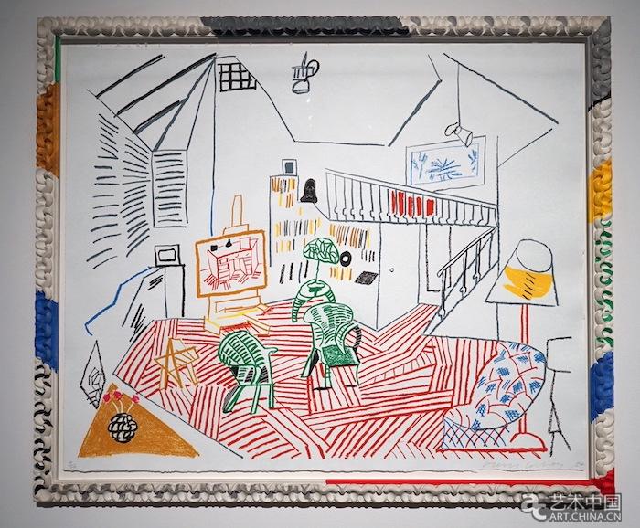 畢加索是霍克尼一生中摯愛的藝術家之一,雖未曾謀面,但一直被霍克尼當作導師。1973年,霍克尼與阿爾多·克羅默蘭克合作,創作了一幅名為《崇敬畢加索的學生》版畫,畫中霍克尼身穿喇叭褲,夾著畫板,站在一尊畢加索的胸像旁,也在本次展覽中展出。在霍克尼移動的焦點中不難發現畢加索的影子,突破傳統的單點透視,在同一畫面中匯聚多種視角。