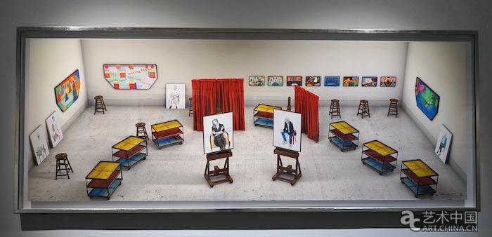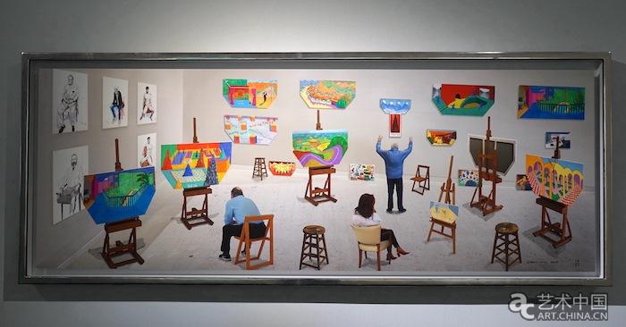 近十幾年來,霍克尼用數碼攝影的方式來描繪他的工作室,成為一種特殊的題材,他將這類作品稱為“攝影式繪畫”。在此畫室被按比例放大,其中包含了他的畫作,有時是對工作室本身的描繪,有時其中充斥著走動、交流、欣賞作品的人們。他用多達200張數碼照片創建一張多視點圖像,使觀眾更容易進入畫面的空間,接近主題。展出的作品《觀眾欣賞現成作品、骷髏和鏡子》中,霍克尼甚至在立方體空間中設置了三面鏡子,鏡子中反射出另一面鏡子中的場景,物體的視角、鏡面的視角各不相同,應接不暇。