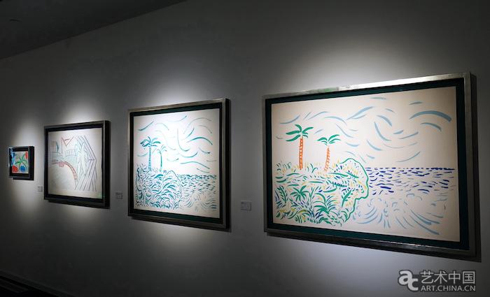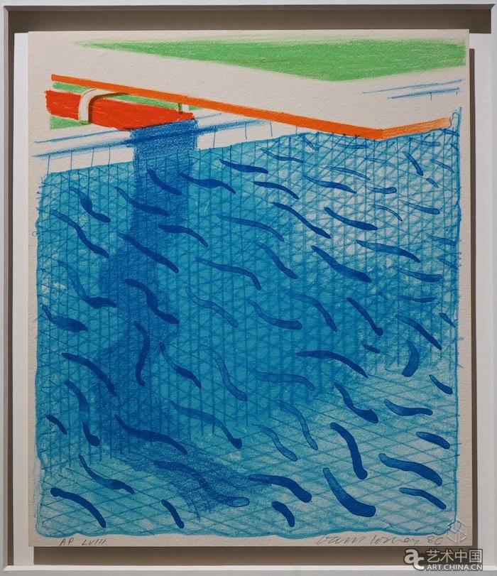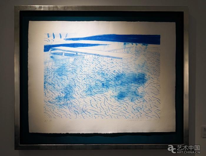 談起大衛·霍克尼,首先想到的是他代表性創作之一《更大的水花》,以簡練線條和色塊描繪了典型加州夢圖景,濺起的水花筆觸精妙,在時空中定格。如同歷史上許多著名藝術家一樣,水是他永恒的主題之一,對水的觀察和研究一直進行著?;艨四岵蹲剿槁湎?、漣漪形成、水花四起的瞬間,描繪水面光影的變化,表現水的透明和流動、表面和深度。本次展覽也展出了《水池》《水波》兩幅作品,通過舞動于水下的線條和光影,表現水的透明、深度和空間關系。然而,區別于對標志性圖片的“偉大”仰視,《紙間漫行》更多展現了一個“多視角”、情感充沛、貼近生活的霍克尼。