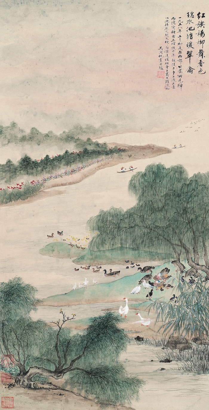 一如海派繪畫的創新與傳統并存,吳湖帆的作品始終保持文人畫的本真,同時將超凡脫俗的主題拉回世俗,如《西郊公園寫景》中“碧水池塘暖翠禽”,公園中老百姓的生活等。畫作色彩層次豐富,將顏色和水墨融合,因而豐富但不俗氣,格調高。