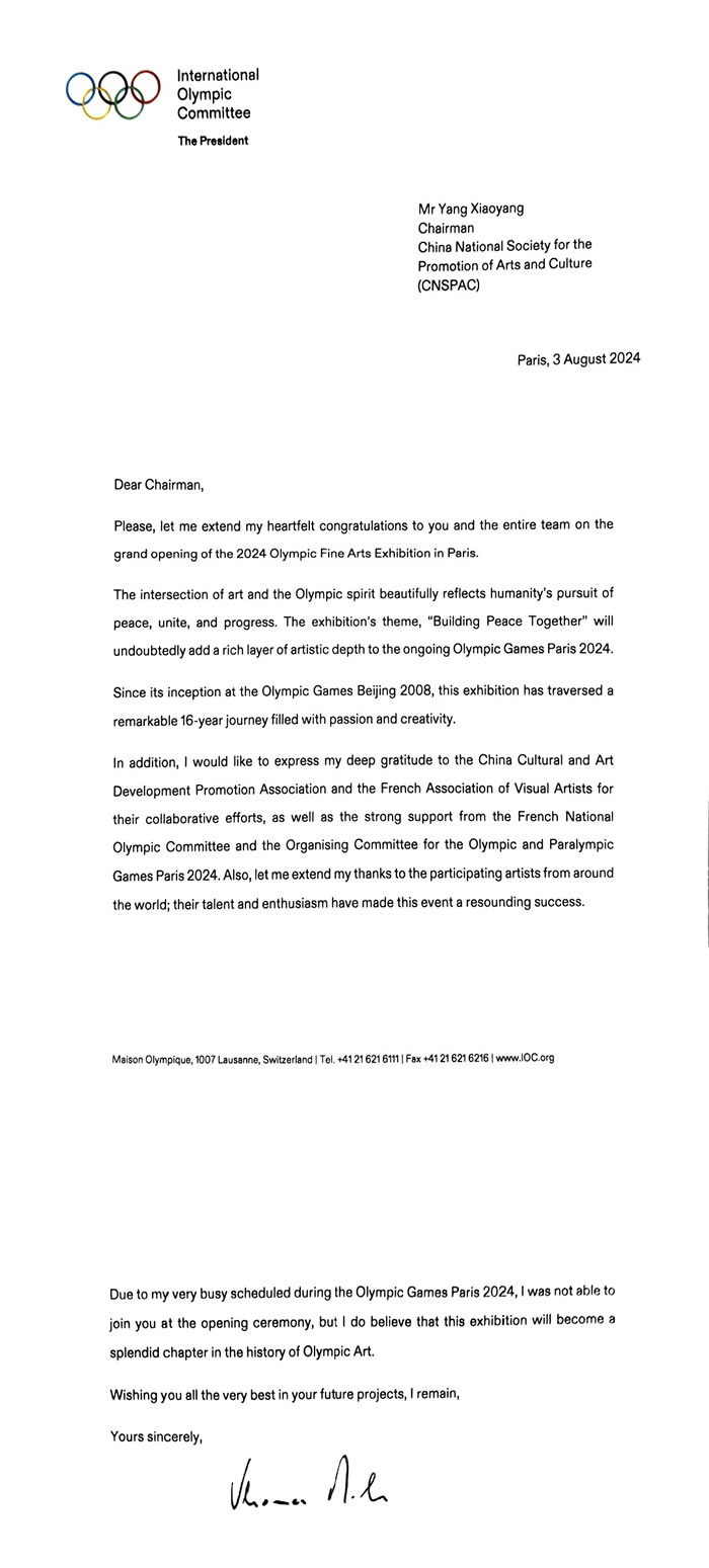 國際奧委會主席托馬斯·巴赫致中國文促會主席楊曉陽的賀信