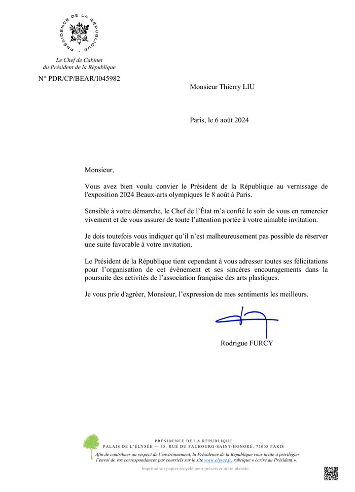 法國馬克龍總統委托總統府辦公廳主任發來賀信,對“奧林匹克美術大會”在巴黎的成功舉辦表示祝賀。法國造型藝術家協會主席雷米·艾融的致辭介紹了法國造型藝術家協會一直致力于推動藝術的發展與交流,同時對“奧美大會”的開幕表達了由衷的祝賀。他認為,藝術是無國界的語言,它能夠跨越地域、文化與種族的界限,觸動每一個人的心靈。