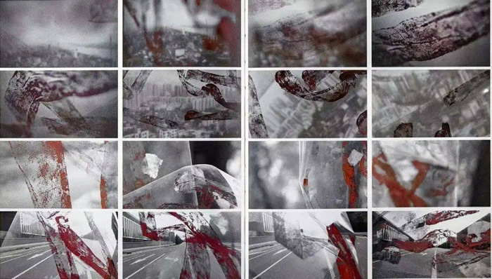 后來我又找到了紗布,用紗布包扎鐵絲網,紗布的柔軟和鐵絲網的堅硬構成了強烈的對比關系。我又將紗布作為拓印轉換成黑色、紅色的水墨作品。紗布轉換成水墨后,其肌理感非常微妙獨特,也很有內涵意蘊。后來我又以“氧氣瓶”“爆炸后的煙花殘件”等做裝置、影像、拓印等作品。