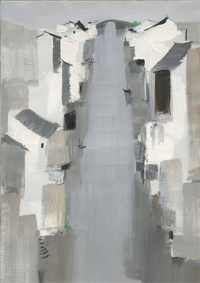 以吳冠中繪畫作品里的江南水鄉為例,畫家通過西方油畫技法來表現中國傳統藝術的黑白水墨,以獨特視角勾勒出江南水鄉的溫婉風情。畫面上,小橋流水人家,白墻黑瓦的經典元素躍然紙上,輔以勃勃生機的綠意盎然,構建出一幅充滿詩情畫意的全景畫卷。大面積的白墻黑瓦在氤氳的江南水汽中格外醒目,仿佛一抹亮色,瞬間點亮觀者的眼眸。屋頂的灰與河道的灰相互映襯,無形中使畫面空間顯得既深遠又開闊,營造出一種超脫塵世的寧靜與和諧。色彩運用上,該作品雖采用鮮艷的色彩與鮮明的筆觸,但整體色調卻異常柔和,這種巧妙的色彩搭配不僅保留了江南水鄉的溫婉細膩,也賦予了畫面西方油畫的空間立體感。如此,既展現了中國繪畫中獨有的意境之美,又融合了西方油畫的視覺震撼,形成了獨樹一幟的藝術風貌。