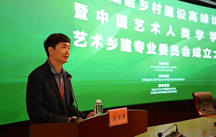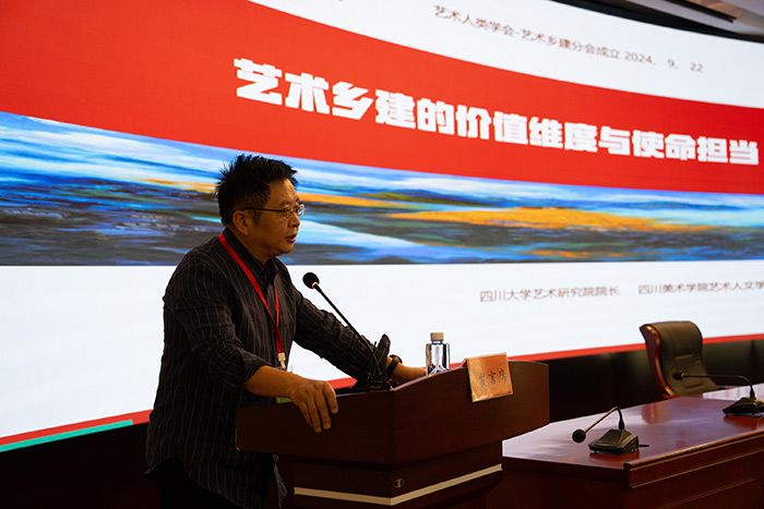 此外,南京傳媒學院副校長陳小波主持了主旨發言環節,四川大學藝術學院學術院長黃宗賢圍繞藝術鄉建為何、藝術鄉建何能、藝術鄉建何為展開發言,他認為越來越多的藝術家關注藝術鄉建、投入到藝術鄉建中,背后是歷史邏輯、實踐邏輯和現實的需求。黃宗賢教授還指出藝術鄉建絕對不是藝術的事實,更不是藝術的空間回憶。藝術鄉建是生態體系的重構與再造,是人與生活實踐關系的重構,是一個系統化的體系建構。對于如何把握藝術鄉建的維度,在黃宗賢教授看來,要避免同質化的問題,應當考慮到中國人基于農耕文明而形成的生活方式,而不是一廂情愿的植入藝術家的理念,應當充分尊重鄉民的主體性。最后他表示藝術鄉建專業委員會的成立必將推進藝術鄉建的理論研究和實踐發展。
