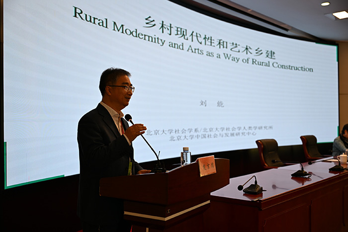 北京大學社會學系副主任劉能圍繞鄉村現代性和藝術鄉建展開發言,就“鄉村現代性”這一議題,劉能教授結合相關案例對鄉村(傳統村落)如何成為文化遺產保護的主陣地、鄉村如何成為人類情感的最主要的保留空間、城鄉一體化前景下農民的法律地位帶來的社會優勢如何發揚、鄉村青年女性作為改革開放以來相對獲益程度最高的一類社會主體,她們的未來作用如何發揮、農民共同體中的“傳統”組織范式如何在“現代性條件”下生發新的活力、互聯網技術、智慧治理和鄉村公共性再造的可能性六大問題作出分析與回答。