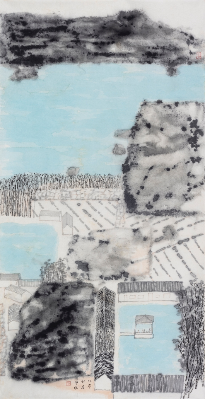 劉學惟《江岸邨居》68x136cm 紙本水墨設色 2022年