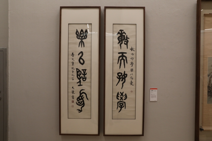 康殷 篆書“敏而好學,樂以忘憂”對聯 書法 130x30cmx2