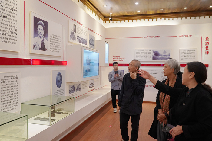 藝術家趙奇、方志敏孫女方麗華等嘉賓在九江市同文中學觀看方志敏烈士事跡陳列