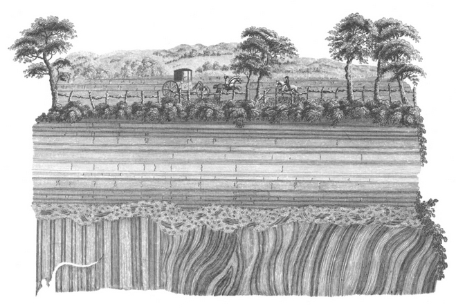 埃爾丁的約翰·克拉克的著名版畫作品《蘇格蘭杰德堡的赫頓地層不整合》。經佩尼庫克(Penicuik)的羅伯特·克拉克爵士(Sir Robert Clerk)許可轉載。