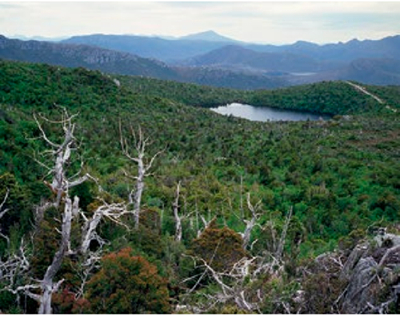 這張由雷切爾·薩斯曼拍攝的照片,題為《休恩松#1211-4033(10,500 歲;塔斯馬尼亞州雷德山)》(Huon Pine #1211-4033 (10,500 years old; Mount Read, Tasmania)),描繪了休恩松林地之外的約翰斯頓湖的景觀。圖片由藝術家提供。