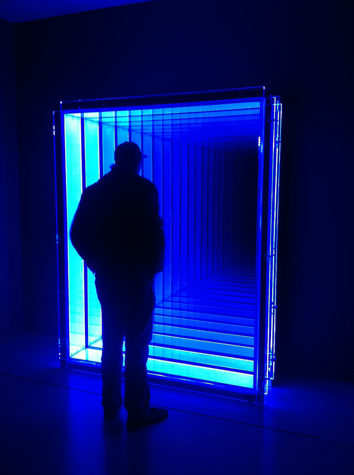 現在巴爾的摩生活工作的藝術家安哲鉉也運用重復的手法來想象無限的循環。他的作品《虛空》由鏡子和燈光等簡單的日常材料構成。安的作品讓人聯想到丹·弗拉文和唐納德·賈德等極簡主義者的作品,他們結合使用普通的日常材料來創造體驗空間。在作品《虛空》中,觀眾站在這件高 7英尺、寬 6英尺的作品前,鏡子中的光反射會產生重復的反射效果,讓觀看者感覺自己面對著無限遠,而自己的倒影則處于中心位置。盡管安出生于韓國,但他的藝術訓練主要是來自西方的。對其作品更加寬泛的解釋可能包括佛教哲學的“空性”,尋求事物和事件的真實本質,或者正如佛教作家和導師劉易斯·里士滿所說的那樣,空性意味著“事物并不像我們所執著的自我所假設的那般存在著”。在這次展覽的背景下對安的作品的這種闡釋開啟了文化、宗教與科學觀念之間看似和諧的關系之間的比較。