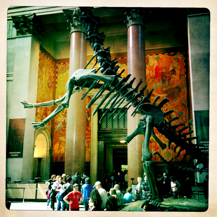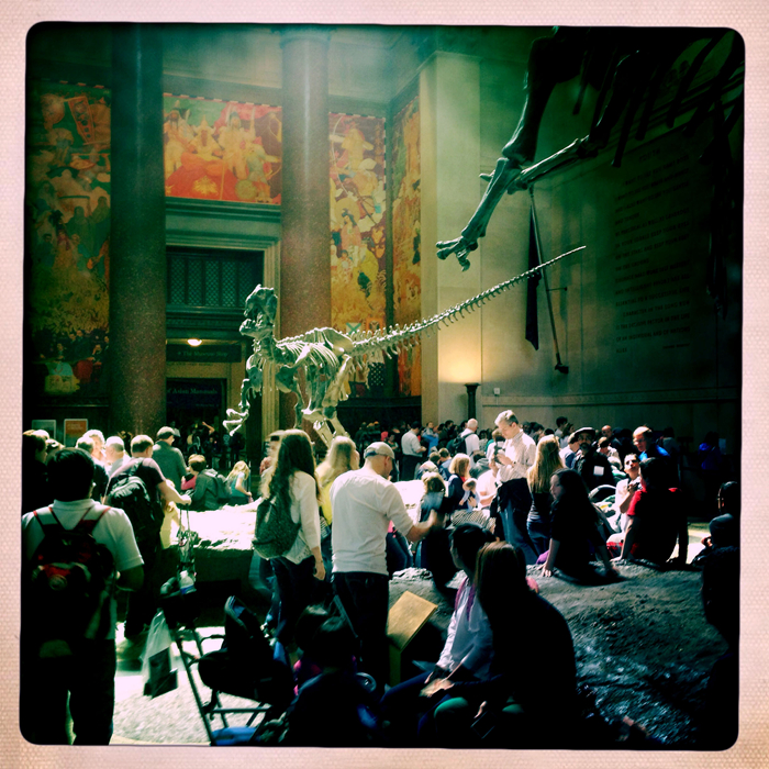 位于紐約的美國自然歷史博物館入口處的恐龍裝置周圍的人群。圖片由美國國家科學院文化項目提供。