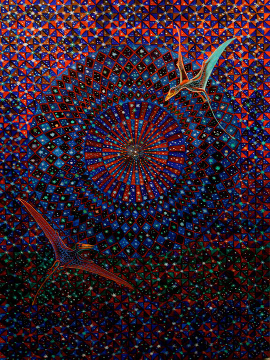通過立體模型和博物館展覽普及恐龍久遠的歷史已經將某種深時的意象嵌入到我們的潛意識當中。這種現象在藝術家阿爾弗雷多·阿雷金夢幻般的畫作《爬行動物的時代》和《深時飛行》(該作品未收錄在展覽中)中得到了體現。阿雷金出生于墨西哥,自 1958年以來一直在西雅圖生活工作。他畫作中的催眠和冥想圖案基于前阿茲特克圖像、墨西哥瓷磚以及幾何與光學的圖案。就自己的童年和早期經歷對創作的影響,他這樣寫道,“當我還是個孩子,在我的出生地,美麗的殖民城市莫雷利亞成長的時候,我的祖父,已故的卡洛斯·門多薩,經常爬上梯子邀請我跟著他到我們家屋頂的平臺觀看夜空:月亮和星星。那是多么令人難以置信的奇觀??!浩瀚的太空、數十億的星系和恒星——這對于一個年輕人來說是難以理解的。在那段時間,我有機會經歷了另一個奇跡:距離莫雷利亞不遠的帕里庫廷火山噴發。