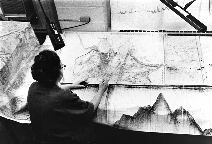 地質學家兼制圖師瑪麗·撒普與同事布魯斯·希森在 20 世紀 70 年代制作了第一張全球海底地圖。圖片由拉蒙特-多爾蒂地球觀測站提供(Lamont-Doherty Earth Observatory)。