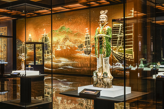 博物館以時間為脈絡,共分為季風、文脈、交織、聯結四個主題空間,分別展示海上絲綢之路的起源、發展、影響和展望。其中,第一空間“季風”展區,以宏觀視角,講述人類從敬畏海洋、了解海洋到利用海洋并開啟航海探索世界的過程。通過海洋文明發展的歷史時間線進行串聯,展現不同歷史時期,海上文化的發展帶給人們生活的變化,構建出一幅幅海上絲綢之路的鮮活景象;第二空間“文脈”展區,以水下考古為線索,以文物為展示重點,從考古視角勾勒出海上絲綢之路的面貌,通過沉船、出水文物、古港遺跡,將海絲歷史直觀呈現出來,用文物訴說中國海上貿易的昔日景象,見證水下封存的古老歷史;第三空間“交織”展區,從商品貿易、開拓使者、文化遺產、移民浪潮等方面,展現東西方經濟文化交流的成果,全方位展示海上絲綢之路對全球文明多元匯聚的深遠影響;第四空間“聯結”展區,聚焦現在,展望未來,通過攝影作品、藝術家創作、裝置藝術品等多種方式,探尋新時代下人類對海洋的保護與探索。隨著中國走向繁榮富強,新的機遇與挑戰,在這條藍色的飄帶上重新被喚醒。