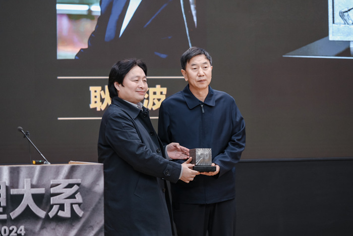 中央美術學院院長林茂為獲得“雕塑學科90年特殊貢獻獎”的山西省政府參事、大同市原市長耿彥波頒獎