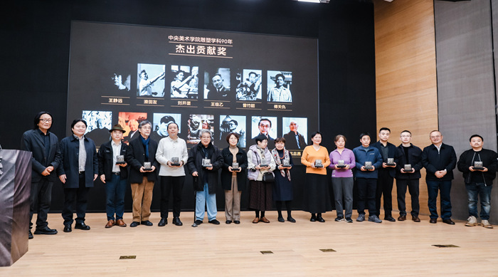 中央美術學院黨委書記徐揚、院長林茂、學術委員會主任蘇新平為獲得“雕塑學科90年杰出貢獻獎”的藝術家王靜遠、滑田友、劉開渠、王臨乙、曾竹韶、傅天仇、錢紹武、盛楊、王克慶、曹春生、司徒兆光、隋建國、呂品昌及家屬代表頒獎