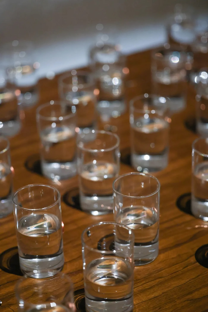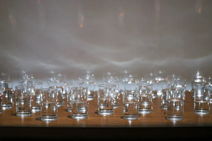 赤松音呂以其細膩的感知力,將“地下之音”轉化為“地上之音”,創作了作品《地磁水琴窟》(Chijikinkutsu)。這件作品由數百個盛滿水的玻璃杯構成,杯中漂浮著細細的針。通過算法控制的電流驅動,連接著玻璃杯上的線圈,帶動針的移動,針撞擊玻璃時發出細微而隨機的聲音。在赤松音呂看來,人類無法直接感知地磁的存在,但它卻時時刻刻影響著地球上的一切:候鳥的遷徙、極光的形成,甚至人類的情緒波動,無不與地磁場緊密相關。這正如聲音在人類社會中的作用——無形無質,卻不可或缺。