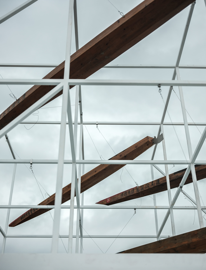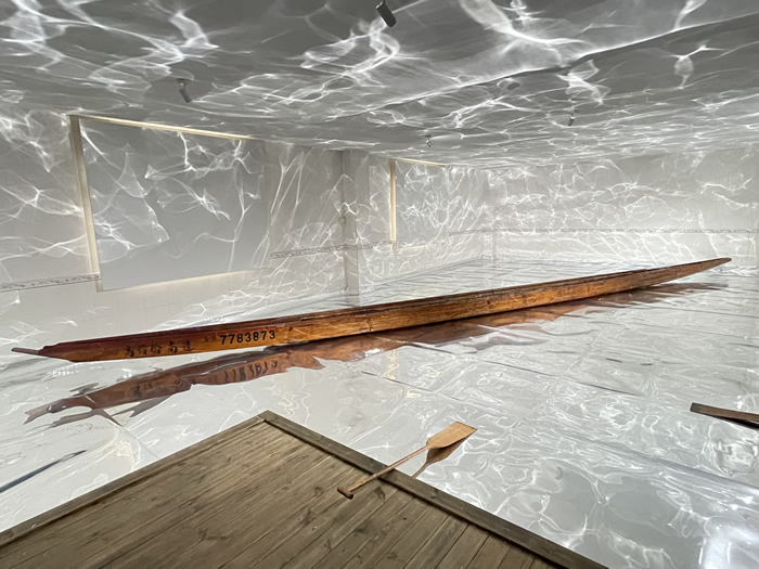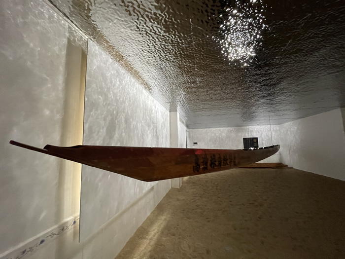 同樣受南海龍舟傳統的啟發,《浮舟》將傳統文化元素與當代藝術相結合,重新啟用昔日九江鎮的河清二村大蠶房,巧妙的將三層樓的物理空間打造成作品的天然分割:一層展廳為觀眾打造一個船行水下的異位場景,人們踩在沙地上,抬頭仰望卻宛若置身水面下方,看到一片片波光粼粼;二層則是水面行舟,在光的陸離中享受水予人的安詳寧靜;而上至天臺,藝術家將龍舟駛向天空,如同漂浮云間,在超現實中實現“浮舟”的三重空間轉化??臻g的異位帶來時間的綿延,昔日熙攘的蠶房曾被廢棄,而在藝術家的創作下又煥發了新生。就如同天臺上那直指云霄的船頭,誰又能預測這艘浮船將承載著這一方水土的傳統駛向怎樣的遠方呢?