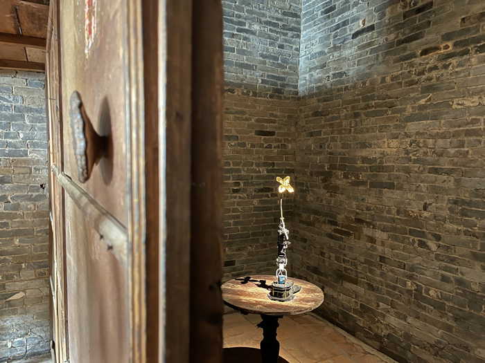 視聽之外,嗅覺也占據著它的舞臺。在煙南村的某個昏暗老屋中,彌漫著中藥植物散發出的柔和香氣。藝術家王忠升將東方養生哲學與西方療愈理念相融合,取材廣府代表性的傳統藥材陳皮,并結合金箔技術將草藥草藥包裹呈現其獨特的價值與美。二樓的房間則用金繕技藝和金箔包裹了一整張古床,作品元素成為對歷史典籍《金花的秘密》的現代演繹,一句“吃好睡好”道出了藝術家在嘈雜現世中追求的樸實的生活哲學。