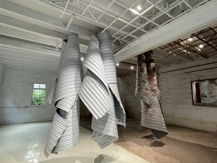 在儒溪村一間曾經被用來養蠶的蠶房里,日本藝術家松本秋則找回了兒時的回憶。24歲之前,他也成長在養蠶的農家,幾十萬只蠶寶寶啃食桑葉的聲音至今仍清晰的回蕩在耳畔。藝術家把被喚醒的童真注入到《蠶的協奏曲》中,就地取材,通過對竹蜻蜓的不斷拓展創新,制造出可以在空中漂浮翱翔的“新生命”,它們隨風浮動搖擺,彼此擊打碰撞出清脆靈動的聲響,宛若一曲新的樂章。