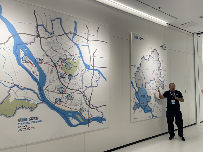 大地藝術節團隊策劃研究與傳播負責人何海洋為嘉賓介紹藝術節區域圖(攝影:付朗)