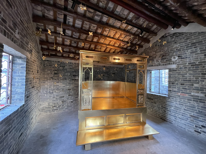 二樓的房間用金繕技藝和金箔包裹了一整張古床,屋頂懸掛著金箔陳皮的“金花”(攝影:付朗)