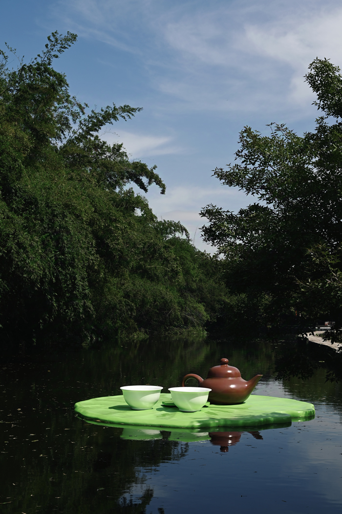 百足古橋跨荷塘,亦是鷺鳥的天堂。龍舟賽事與竹林鷺影是璜磯的最美名片。知名漫畫家TANGO圍繞白鷺這一主題,結合廣東的飲茶文化創作了實體結合AR的作品《茶之鷺》。一方面將東方美學融入自然景觀,另一方面則巧用現代技術,游人可通過手機掃描的方式AR參與到這個輕互動環節中,屏幕中的白鷺以悠閑之姿緩慢飲茶,形成了虛擬和現實在自然間的和諧呼應。