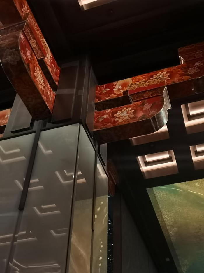 第二,工藝革新方面,展廳廊柱采用的景泰藍斗拱是一大亮點。我們特別邀請到國家級工藝美術大師、景泰藍非遺技藝傳承人李軍老師和鐘連勝大師共同設計,并在該廠精心打造而成。斗拱上的圖案專為美高梅設計,融合了澳門象征的荷花(蓮花)元素,以及寓意吉祥的牡丹和銀杏。我們希望通過這些傳遞中華文明的匠心與沉淀千年的智慧底蘊。