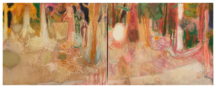 70油畫公社與八零油畫學會的十余位中青年藝術家參加了本次主題創作活動,包括姚剛、辛建偉、彭毅、孫昌武、許章偉、張振江、梁智龍、李永光、楊芷、袁景、廖有才等。他們或以具象方法描繪廬山的自然美景,或以抽象語言表現廬山帶給自己的感受,亦有以超現實主義手法著重體現了廬山的人文故事。如梁智龍的《廬山日記》系列描繪了廬山周邊不同的景觀,同時每一幅作品中都有特定的人物或動物出現,現實中拍照打卡的游客、乘鳳歸來的神仙、白鹿洞書院中的石鹿、……這種巧妙的構思讓人體味到廬山每一處代表性景觀中自然與人文的悠久關系。
