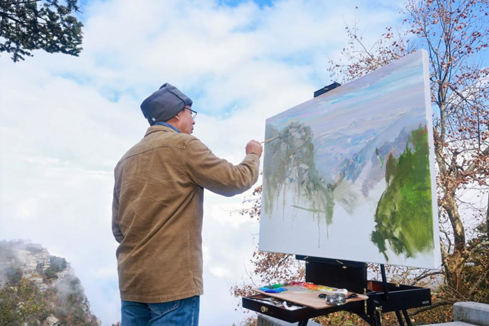 與夏季的蔥蘢蒼翠不同,十一月的廬山被潑灑上了點點火紅與金黃,頗為適合具有豐富色彩表現力的油畫語言。在廬山上的三天時間里,晴、陰、雨、霧悉數上演,更是讓藝術家們體會了千變萬化、濃妝淡抹的多面廬山。