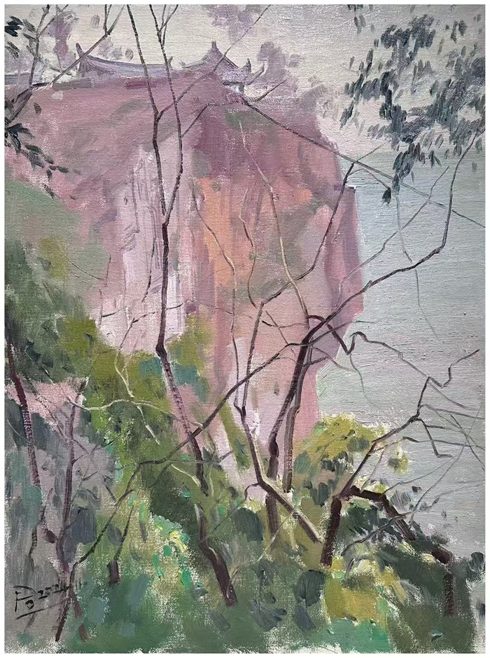 大連市油畫學會會長王嵬偏愛人文與自然相交融的景觀。他有一幅畫描繪了廬山利瑪竇靈修中心,這座建于1894年的老教堂,至今保存完好。他的思緒沉浸于歷史與現實的交響之中,他認為寫生是一個與歷史對話的過程,可以從中讀取穿越時空的信息,同時也是對自我內心的洗禮與觀照。