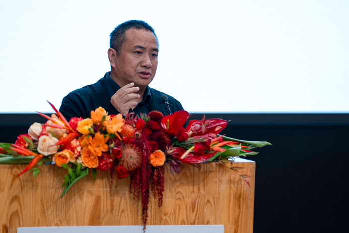 中央美術學院研究生院副院長吳嘯海教授的演講主題為《以材料語言作為反觀繪畫的工具——壁畫材料創作的教學路徑》,吳教授從壁畫材料創作的教學經驗切入,認為繪畫發展的動力在于找到與繪畫保持一定距離的審視位置,以材料為創作語言從而反思繪畫路徑。面對當下的AI技術,鼓勵學生運用AI工具,學生應甄別、運用、改造并提供新的數據庫存素材。他認為AI視覺生產的路徑方式比對反觀傳統繪畫提供了新機會,談及繪畫問題,吳嘯海提出美術學院學生培養的專業性在于判斷力、執行力,以及反思能力,他認為藝術的動人之處在于具備反思能力。吳嘯海還結合個人以及學生創作的經驗,強調了材料運用和課堂互動對學生思維啟發的重要性,呈現了中央美術學院在美術教育人才培養上的新路徑和方法。