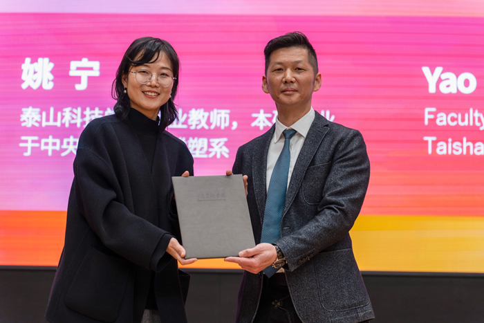 在捐贈儀式環節中,中央美術學院藝術管理與教育學院副院長、美術教育學系主任黃勇教授為泰山科技學院專業教師姚寧頒發捐贈證書,本碩畢業于中央美術學院雕塑系的姚寧女士為央美藝術管理與教育學院捐贈了30余件稀有的石膏教具,為學院美術教育教學、學生藝術實踐提供了有力支持。
